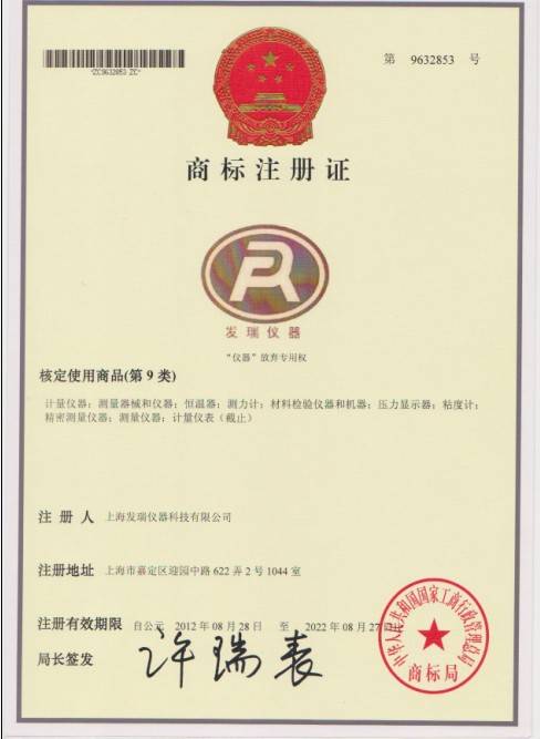 上海發瑞儀器科技有限公司也一直致力于提升品牌競爭力,在浩如星辰的儀器公司里樹立自己特色的商標品牌路線。經過歷時一年半的商標注冊申請,2010年5月28日經**商標局批準的“發瑞儀器”“FR”以及公司圖案logo正式通過注冊商標申請,并核發了商標注冊證。從此“發瑞儀器”“FR”字樣以及公司圖案logo正式成為我公司的專用商標,得到市場的承認和**法律的保護。這是拉力機,拉力試驗機發瑞儀器公司實現品牌戰略的重要一環,具有里程碑式的歷史意義。